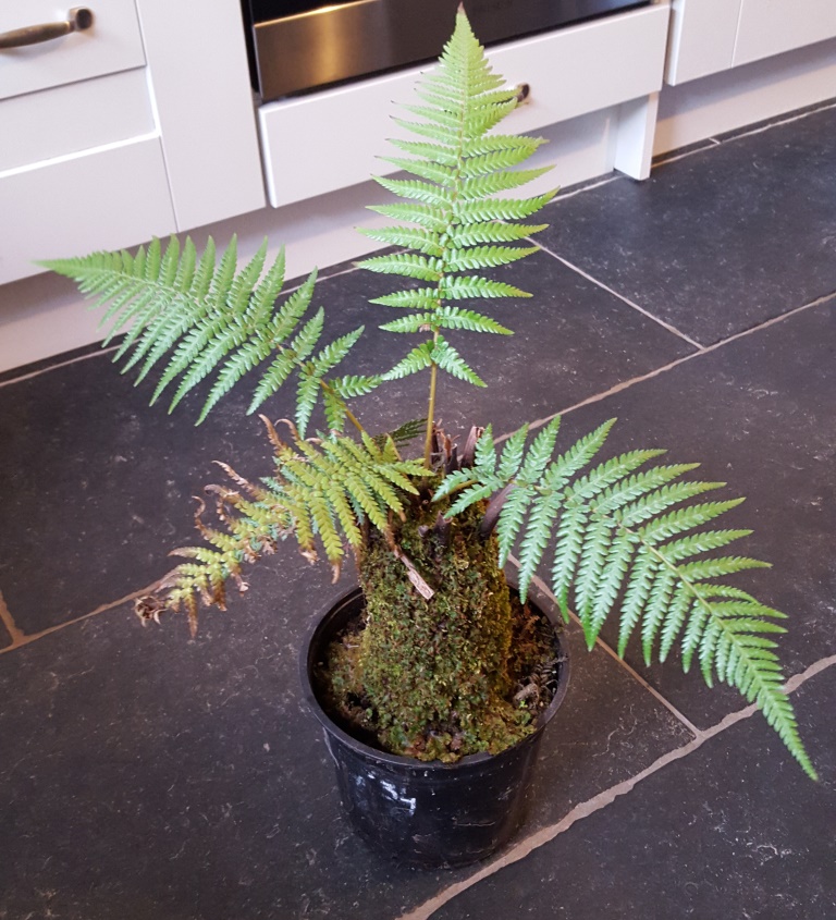 Overigens bij de aanschaf stond de boomvaren in een onwijs grote kuip....te verdrogen. Dat is makkelijk te voorkomen door de kroon en stam vochtig te houden.