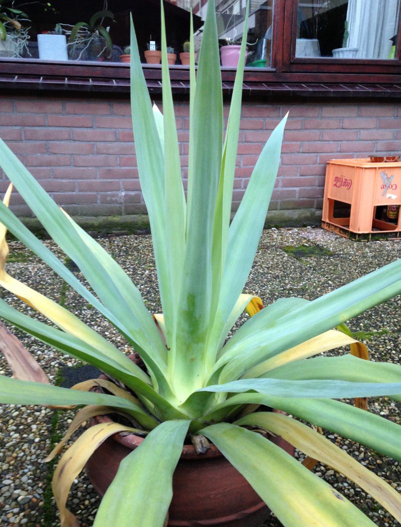 Ik heb zo'n 5 jaar geleden een Agave gezaaid en dit is nu een redelijk grote plant geworden. Ik weet niet meer goed welke soort ik gezaaid heb maar ik dacht het de Agave Americana of de agave deserti var. simplex was. Helaas zie ik dit niet terug in de uiterlijke kenmerken. De bladeren hebben bijvoorbeeld nauwelijks stekels aan de zijkanten (echt heel miniscul) en geen doorn op het einde van het blad.