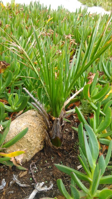 Groeit ontzettend traag. Is nog erg klein. Heeft merkwaardigerwijs zeer korte vederbladeren, hoewel het stammetje op die van een Washingtonia lijkt. Een hybride? Hij heeft winterschade ondanks locatie Zuid-Frankrijk zone 9b.