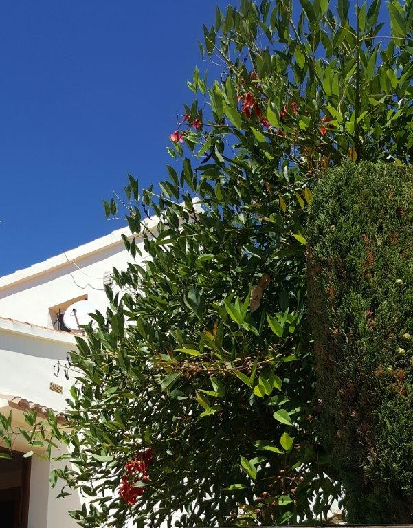 Bij ons aan de Costa Blanca in Spanje groeit deze boom/struik. Op dit moment staat hij te bloeien maar aan de peulen te zien doet hij dit constant. Wie weet hoe deze heet?