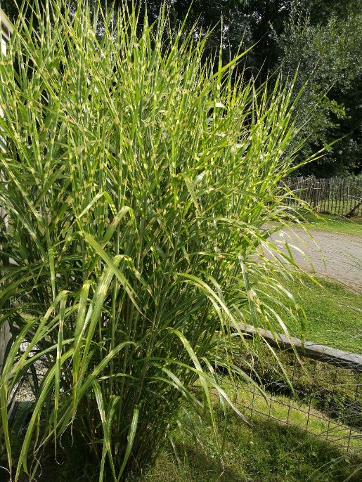 Het gaat hier om de soort Miscanthus sinensis 'Zebrinus'. De soort is winterhard en bloeit met bruine aren gedurende de zomer/herfst. Dit siergras kan je het beste in het voorjaar op ongeveer 20 cm boven de grond afsnoeien. In april loopt de plant dan weer uit.