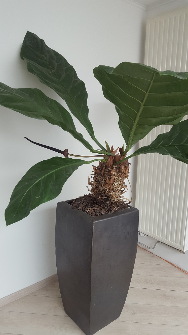 De bladeren zijn wel ongeveer 70cm lang en 30cm breed. Hij geeft ook sinds 2 maanden lange bruine/zwarte stengels waar vaak wat waterdruppels "uitzweten".