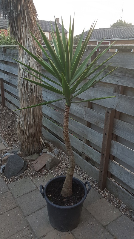 Yucca elephantipes 'Jewel' of een andere bontbladige variant. Het blad lijkt ook op dat van Yucca gloriosa variegata, maar die verwacht je niet met zo'n snelgroeiende stam.