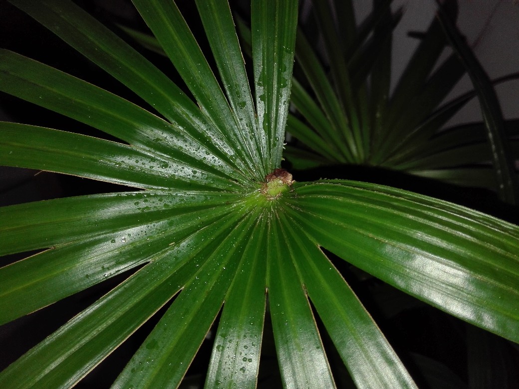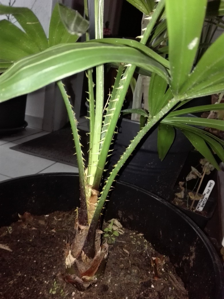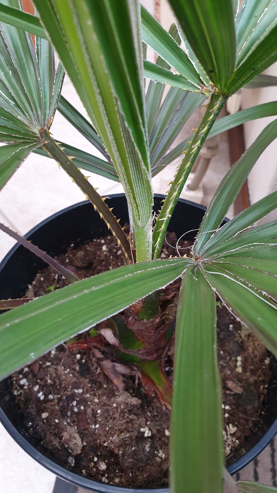 Livistona australis is berucht vanwege de scherpe haakvormige doorns op de bladstelen. Ik bleef er bij het verzorgen geregeld aan vasthaken. :mrgreen: Aan de roodbruine bladvoet mag je concluderen dat dit met zekerheid L. australis is. Zet de palm in de zomer buiten op een zonnige plek om de compacte groei te behouden. Geef deze binnenplant wel een week de gelegenheid op aan de zon te wennen.