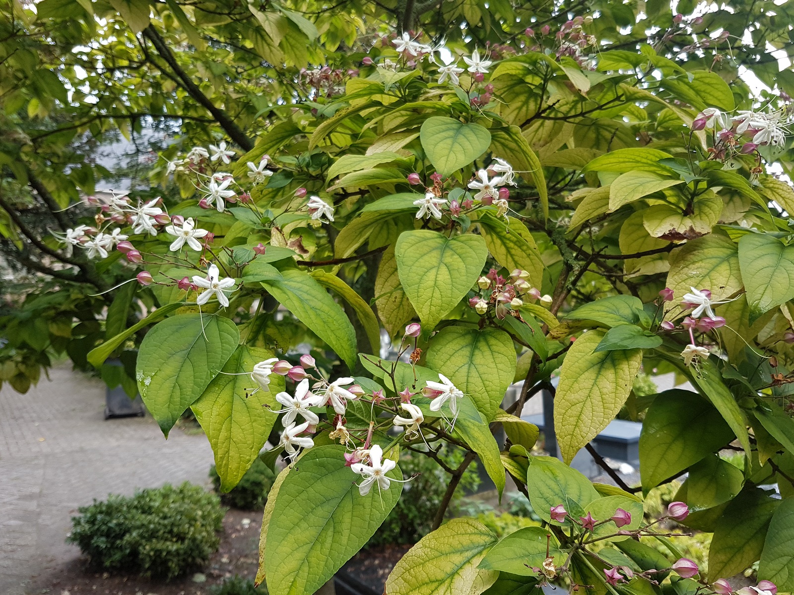 Clerodendrum trichotomum var. fargesii. Bedankt Eduard je was me te snel af. ;) Ik heb de rijkbloeiende boom in de tuin. Het is een van mijn favorieten samen met de sp. bungei die wat later bloeit. Bloemen welriekend, na de bloei verschijnen de blauwzwarte bessen met de persisterende rode kelkbladeren. Deze is makkelijk uit het zaad te vermeerderen.