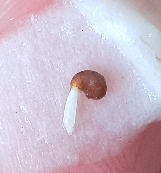 De andere zaadjes die overigens hetzelfde lijken te zijn liggen nog in het keukenpapier te ontkiemen. Vandaag zag ik er aan een een klein worteltje komen.