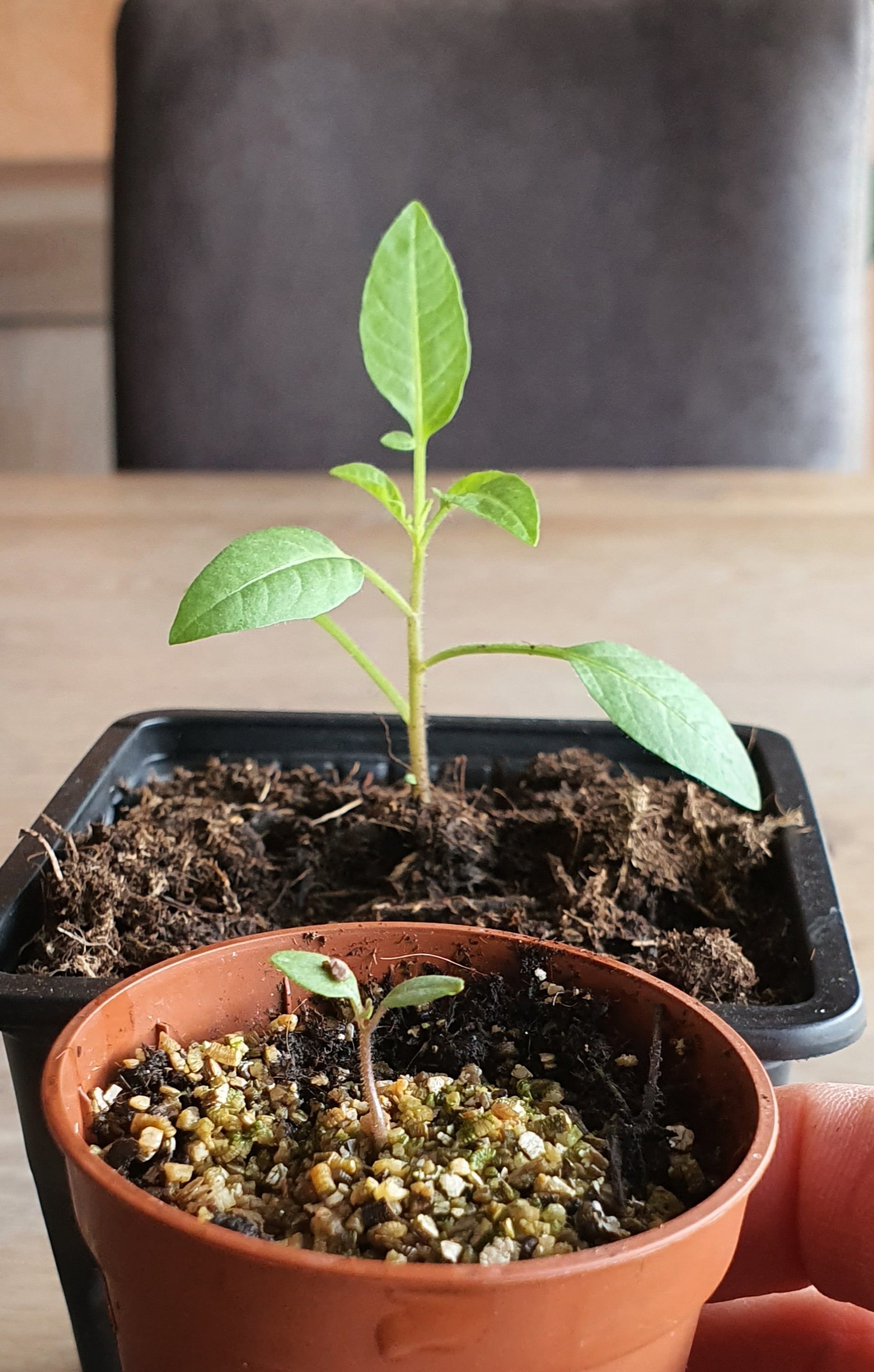 Eind februari heb ik in een bakje gesneden vers fruit een paar zaadjes gevonden. Nieuwsgierig als ik ben heb ik de zaadjes in nat keukenpapier en in een sealzakje gedaan. Het eerste zaadje ontkiemd al na 2 weken en is nu dit geworden