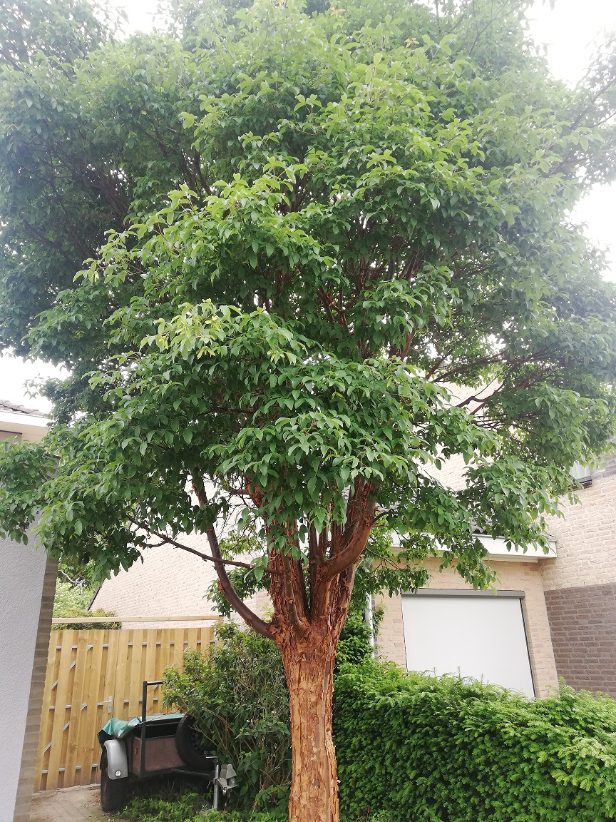 Ik zie hem heel zelden in voortuintjes staan, maar ik vind het een bijzonder mooie boom. Vooral de stam en het contrast met het blad. Geen bijzondere bloemen gezien. Is kaal in de winter. Weet iemand wat dit is?
