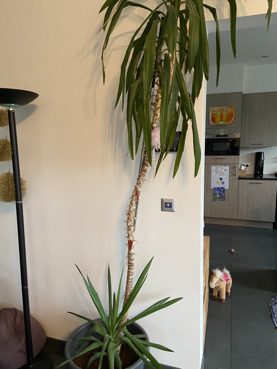 Dat zou je denken. Maar ik denk toch aan een gewone Yucca elephantipes, maar een die jarenlang op een plek is opgegroeid waar niet veel licht is. Dan blijven de stammen ook veel dunner.