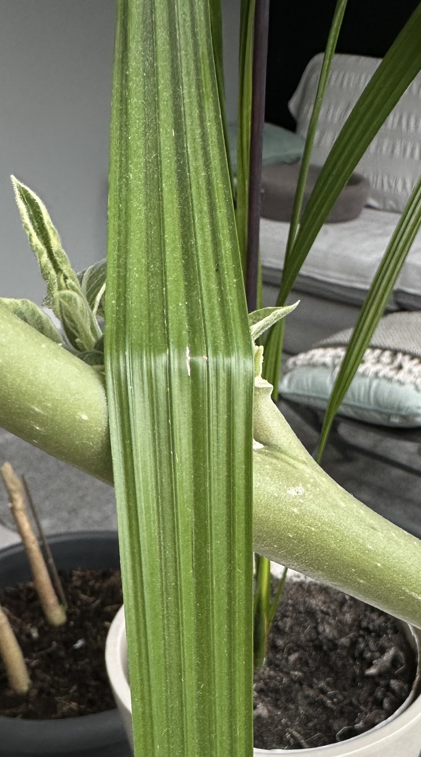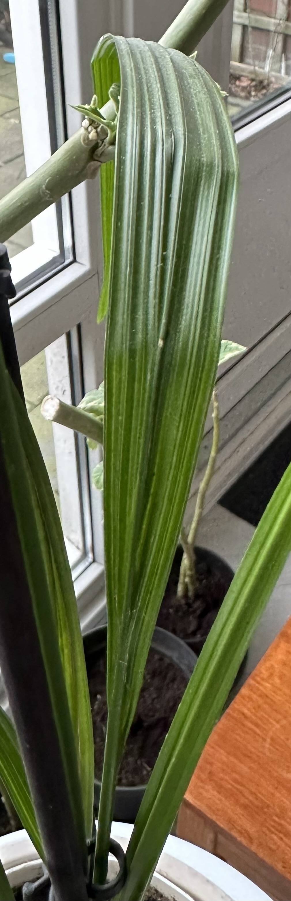 Denk eerlijk gezegd niet dat jouw zaailing dat is, ik blijf bij Syagrus. Zeker nu ik zie dat zich een blad al deels gedeeld heeft. Typisch Syagrus met de slappe dunne afhangende bladsegmenten.