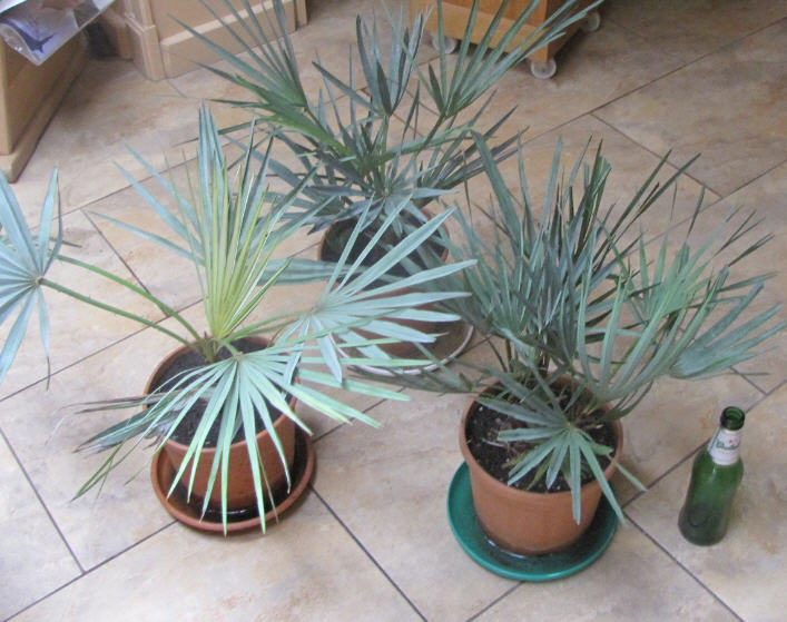 Ik kwam een paar weken terug bij een tuincentrum bij ons in de buurt. Ik weet dat daar in deze tijd van het jaar nog wel eens koopjes qua exoten te vinden zijn. En inderdaad er stonden er een aantal Chamaerops humilis var. Cerifera en tot mijn verbazing ook nog een aantal met 2 en 3 stammetjes en dat voor de prijs van € 3.95 . Dus heb ik er maar een 5-tal in mijn karretje gepakt. Een ervan zag er wel iets anders uit, maar vond die toch wel mooi en nu heb ik het gevoel dat het misschien toch wel een andere palm is.
