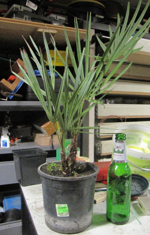 En dan nog even een foto van de andere kant en met een bierflesje om de verhouding van de groote van de palmen aan te geven en ook het kleur verschil