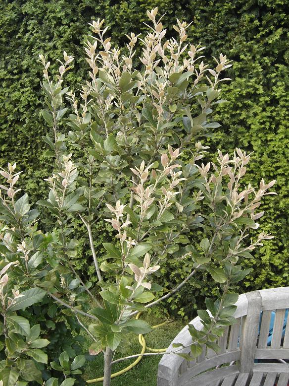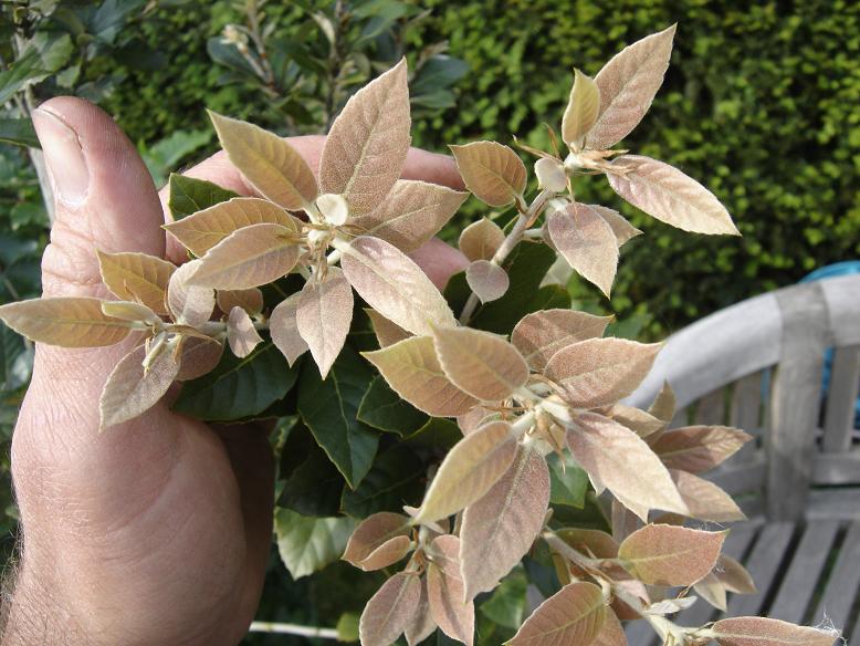 Een 5- tal jaren geleden zaaide ik enkele eikels van de steeneik. Groot is nu mijn verbazing als ik naar de jonge blaadjes kijk. Bij één boom zijn die groen en bij de andere rood. Verder zien beide boompjes er identiek uit.