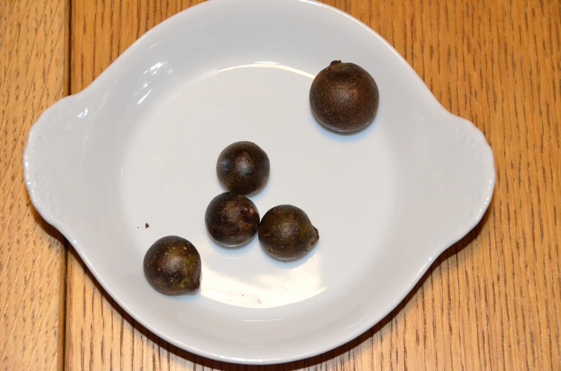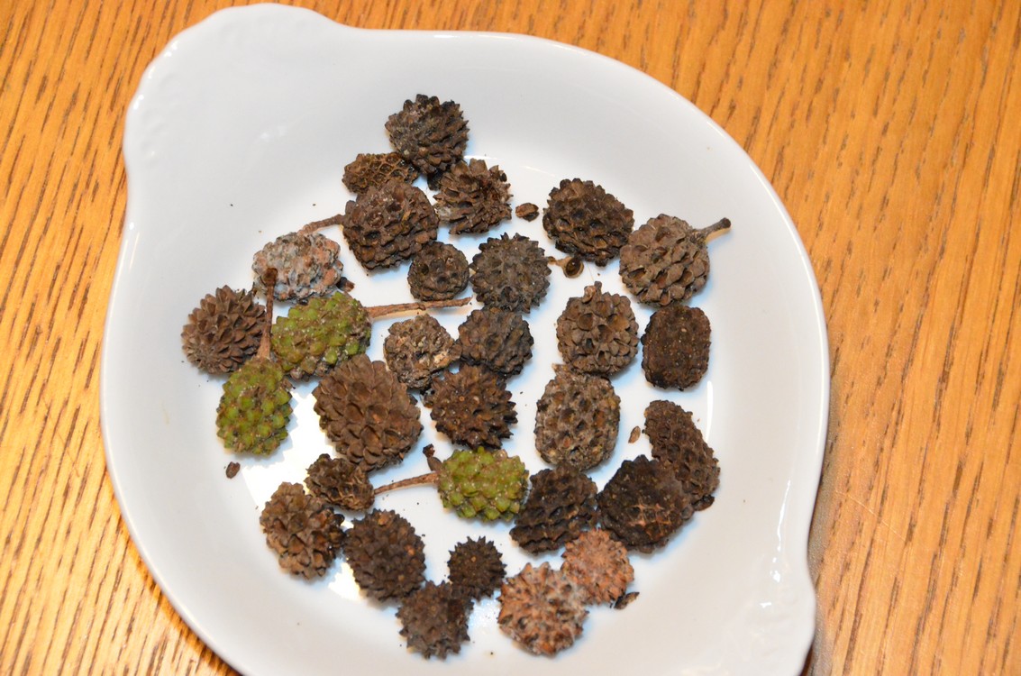 Bij Nr 109 moet ik nog eens goed schudden om de zaadjes er uit te krijgen, lijken op gedroogde moerbei vruchtjes, maar waarschijnlijk eerder van een conifeer...