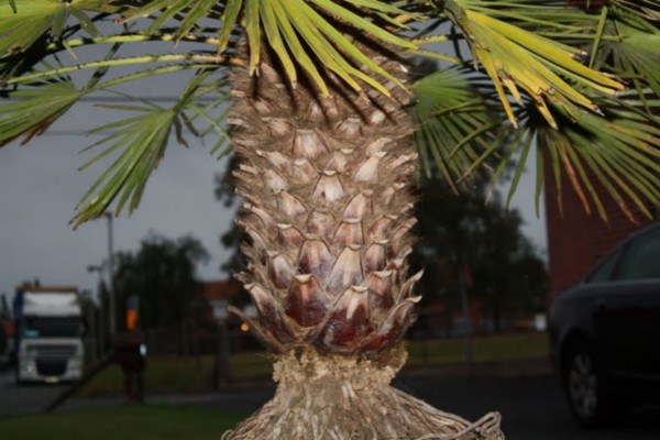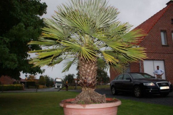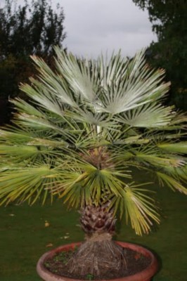 Hij had eerder al beschreven dat hij nog nooit zijscheuten heeft aangemaakt, dus Chamaerops humilis denk ik alvast niet, Cerifera ook niet (geen zijscheuten en echt wel groen blad) Toen dacht ik aan Trachycarpus fortunei maar door de stekeltjes op de bladstelen ook weer mis, en ook door de stam (niet echt veel vezels/haar te zien.