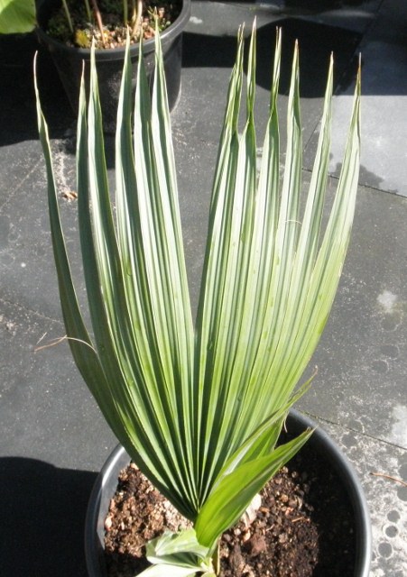 Maar ik vind het eerlijk gezegd moeilijk te zien op de foto welke soort het wél zou kunnen zijn. Waar het oude blad is weggeknipt, lijkt je palm op een Sabal-soort, maar of ik dat goed zie? Aan de andere kant vind ik de kleur van het blad wel heel groen voor een Sabal...