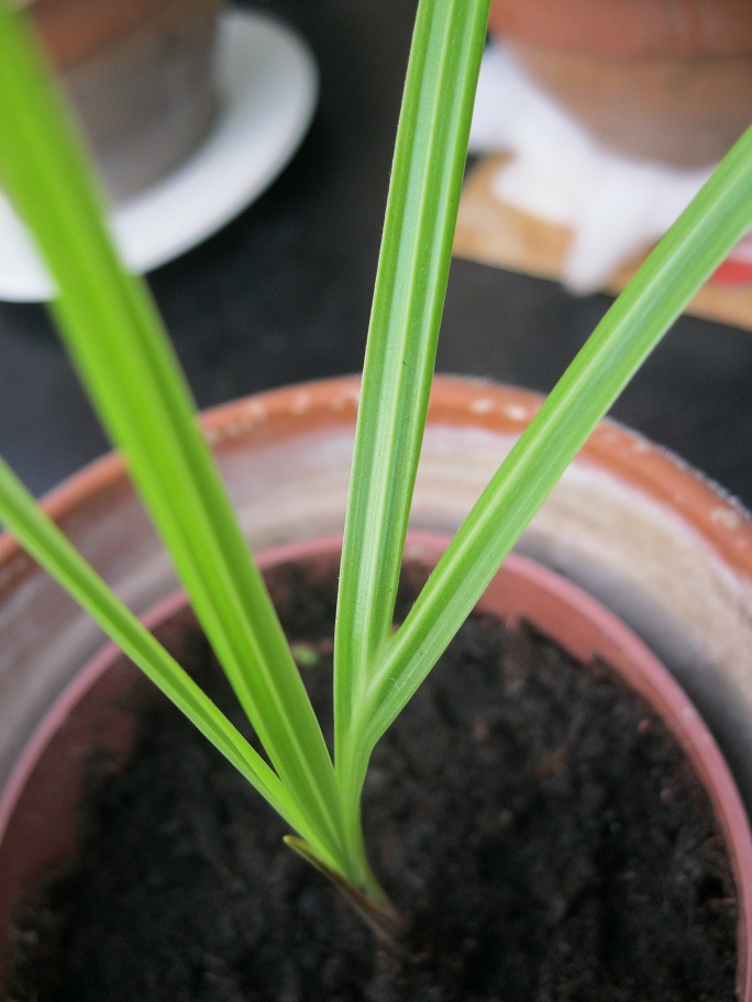Ik heb hier H. verschaffeltii staan van 3/4 jaar oud, en de middenrib en vroege splitsing is idd wel erg kenmerkend. Over een jaartje weet je het echt wel zeker.