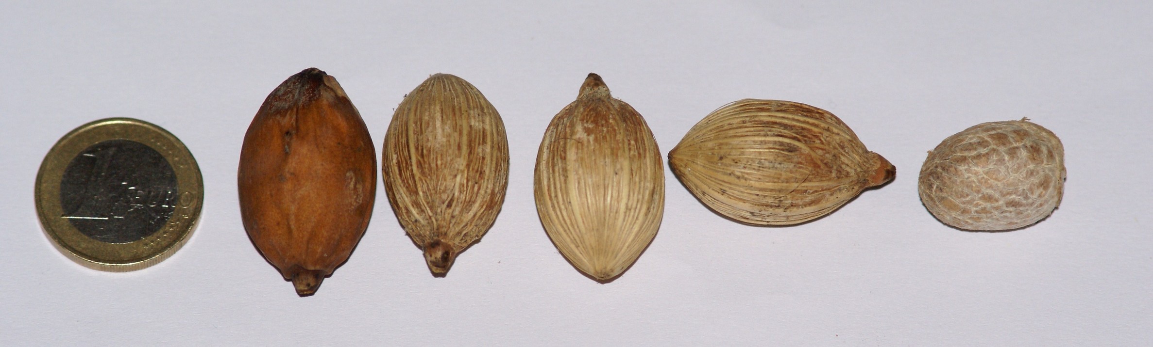 hallo ron,,ik denk ook sterk dat de 4 eerste op foto voor mij duidelijk de adonidia merrillii zaden zijn,hele mooie palmen trouwens,herken de zaden ,omdat ik ze ook zelf uit aruba heb mee genomen en meteen gezaaid,wel ,het zijn nu al kleine plantjes en groeien lekker,,wordt ook wel kerst palm genoemd,dit omdat het omstreeks deze tijd ( kerst ) meestal vol zit met rode bessen waar dus die zaad (nootje ) in zit,,bij het drogen zien ze er uit als op je foto,,dus zaaien die hap,,die andere die laatste lijkt wel anders uit te zien is kleiner en stomper,,dus die weet ik niet welke dat is,maar er zullen wel meer mensen zijn die het wel weeten,,maar goed de eerste 4 weet ik zeker,,en ze kiemen vlot ook nog ,,m,v,g, paul,,