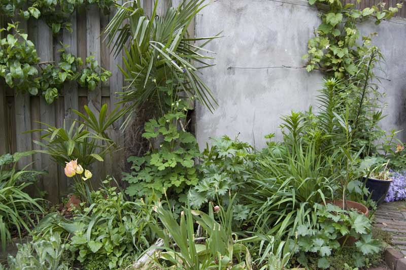 Heel gezellige tuin! ik zie veel planten die wij ook hebben. De musa basjoo groeit bij ons ook nog amper hoor. De tetrapanax wel, die heeft al 5 bladeren, nog niet groot, maar dit jaar gaat ie eindelijk lekker aan de groei. Staat je grotere trachy niet heel erg dicht bij de schutting?? Die heeft dalijk best wel wat ruimte nodig hoor, maar het kan ook een vertekening van de foto zijn. Dracunulus gaat hier ook voor het eerst lekker!