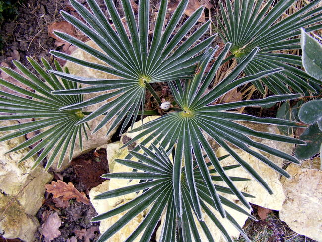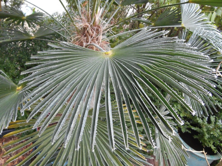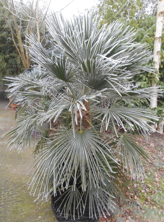 Na een nacht met mist en matig vorst ziet de wereld er anders uit. Trachycarpus wagnerianus heeft zich tegen verdamping beschermd door samentrekking van de waaiers.