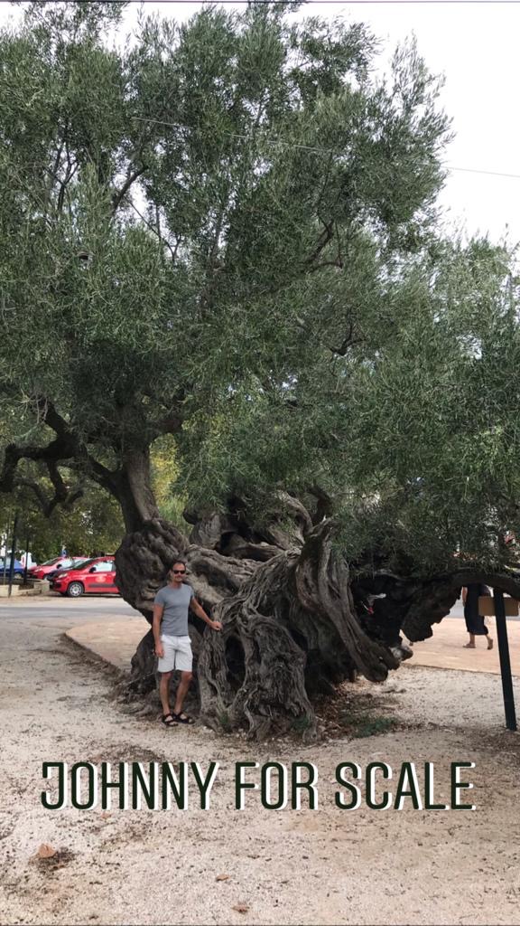De oudste olijfboom van het eiland is volgens het bordje dat erbij staat >2000 jaar oud.