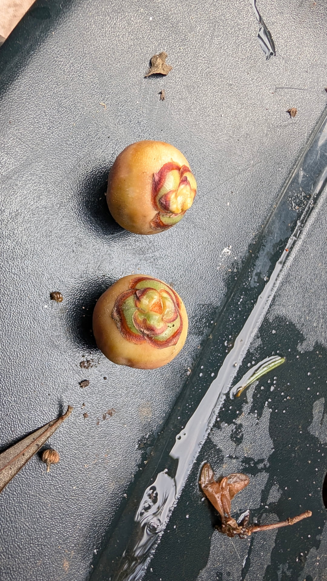 Ik heb vandaag een paar butia zaden geraapt, ontveld en in de week gezet. De twee bloemknoppen heb ik uit de boom verwijderd en weggegooid. Na de vorst gingen de vruchten snel achteruit. Ik ben benieuwd of er wat uitkomt. De vruchten zijn uiteindelijk gegroeid tot een breedte van rond de 20mm.