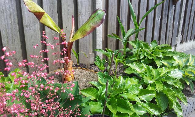 - Stukje met hosta's, sikkemensis pups, Canna's, maurelli en een stekje van een vijg.