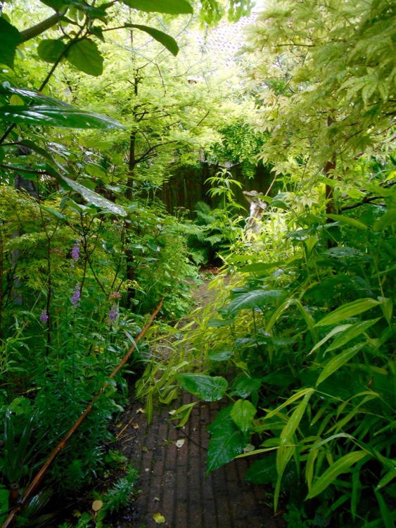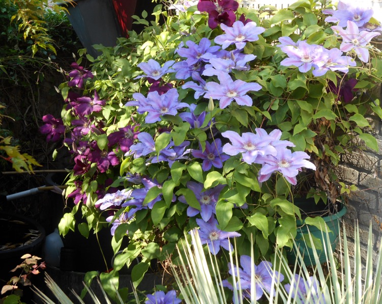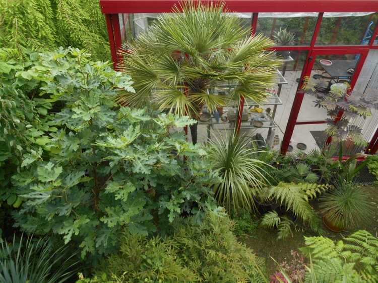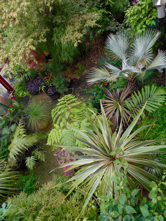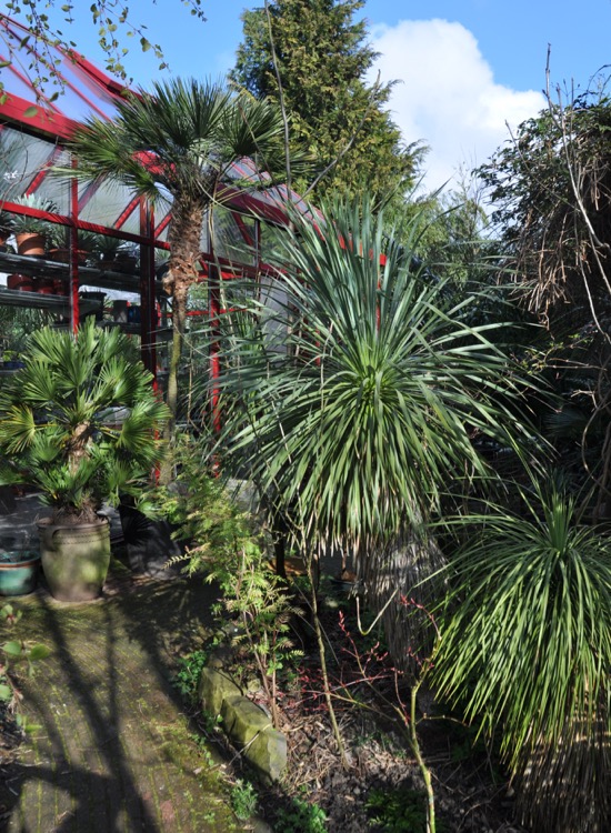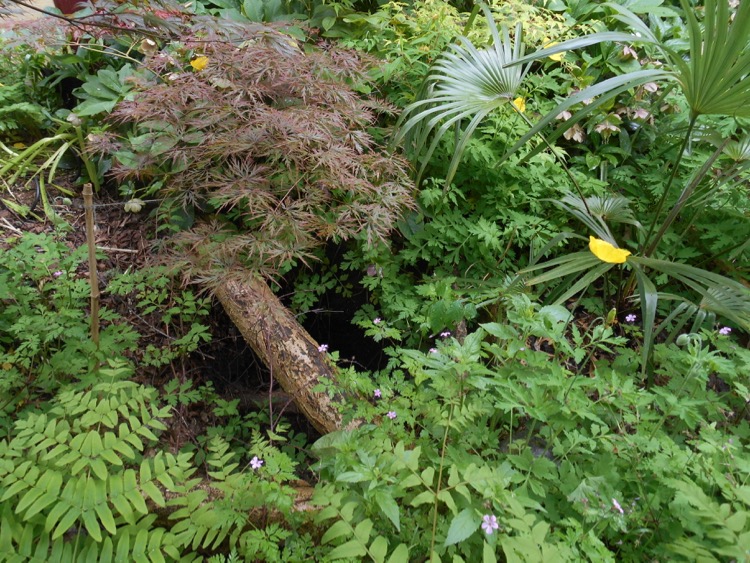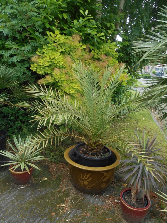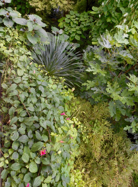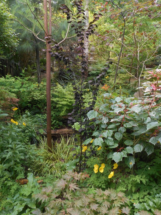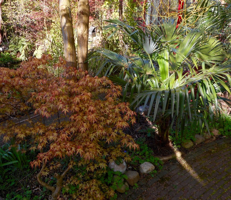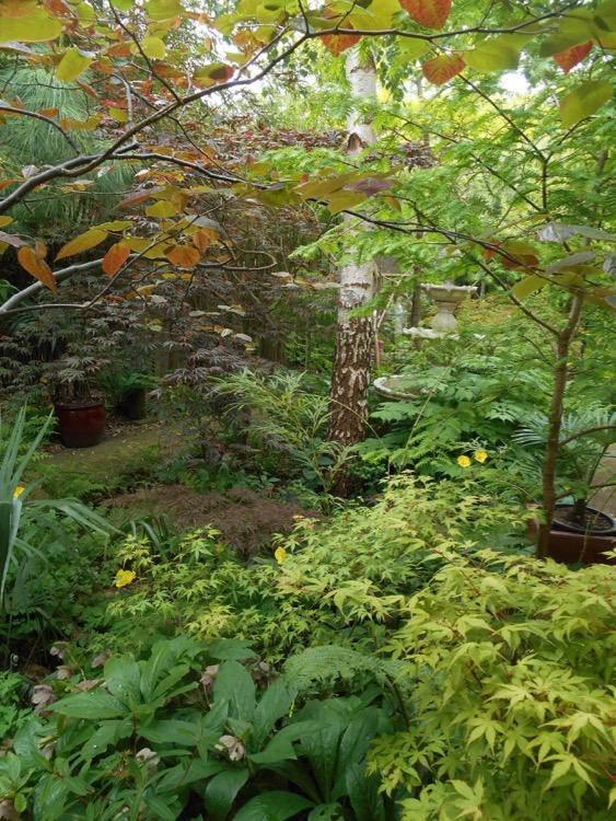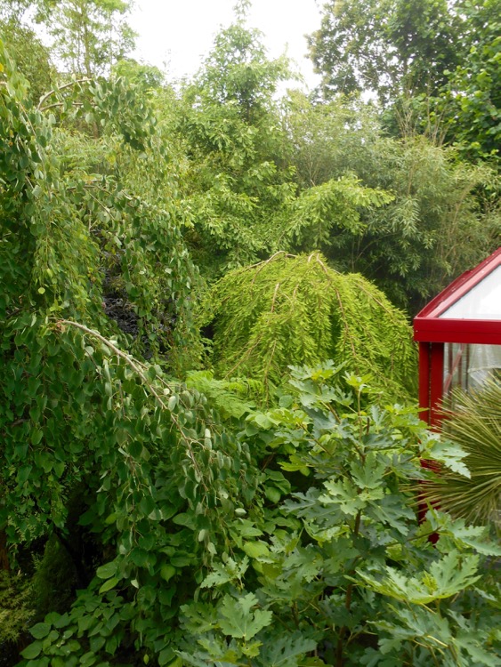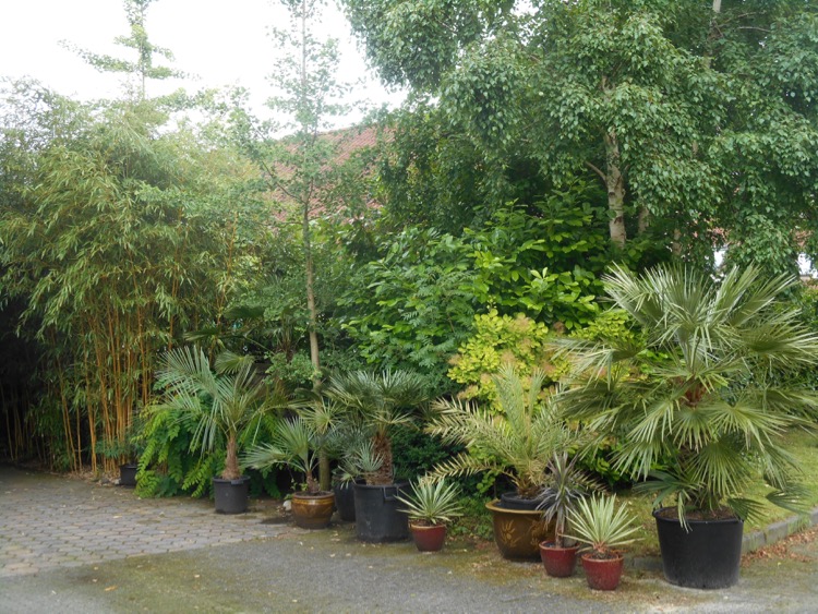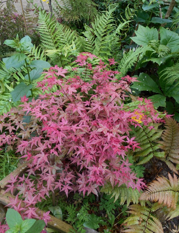 Met het donkerrode blad is Cercidiphyllum japonicum 'Rotfuchs'. Dit is een langzame groeier vergeleken bij de soort. De plant rechts daarvan is Acer x conspicuum 'Silver Cardinal' (synoniem Acer rubescens 'Silver Cardinal'). Deze bontbladige Acer is gevoelig voor zonnebrand zoals veel variëteiten Japanse esdoorns. Het verzamelen van Acers is een van mijn passies en ik kan de verleiding vaak niet weerstaan om weer met een cultivar thuis te komen. Voorlopig is zo 'n nieuwkomer gedoemd in een kuip te verblijven totdat ergens een plek vrijkomt.