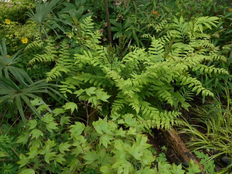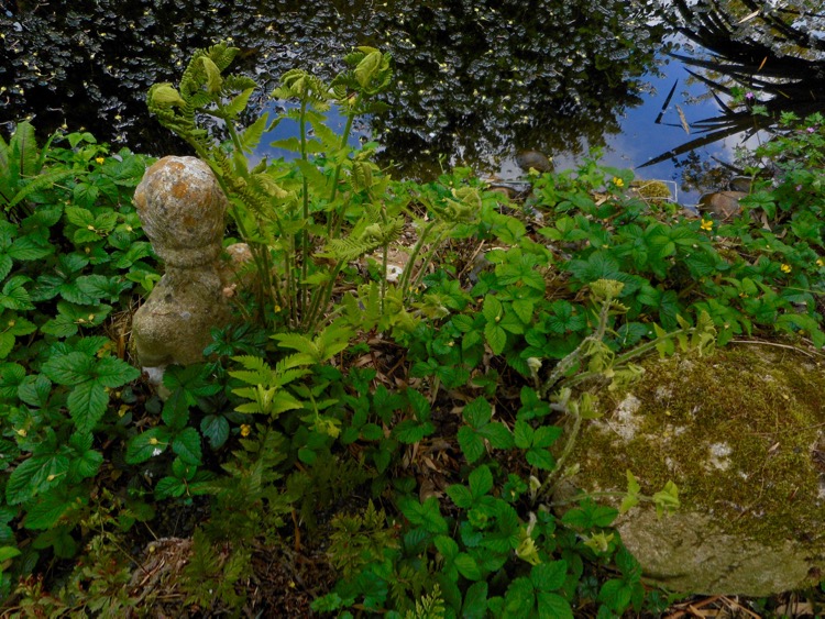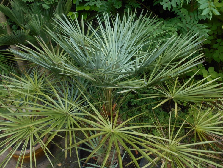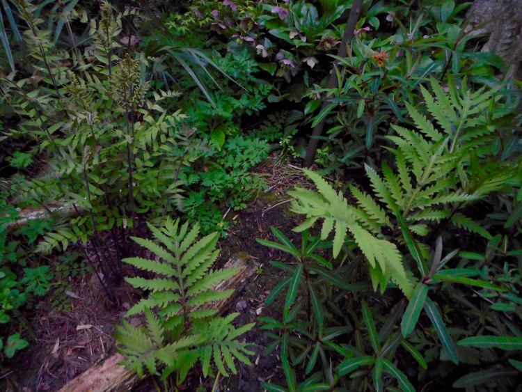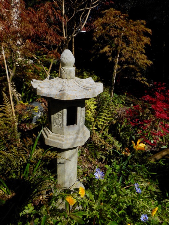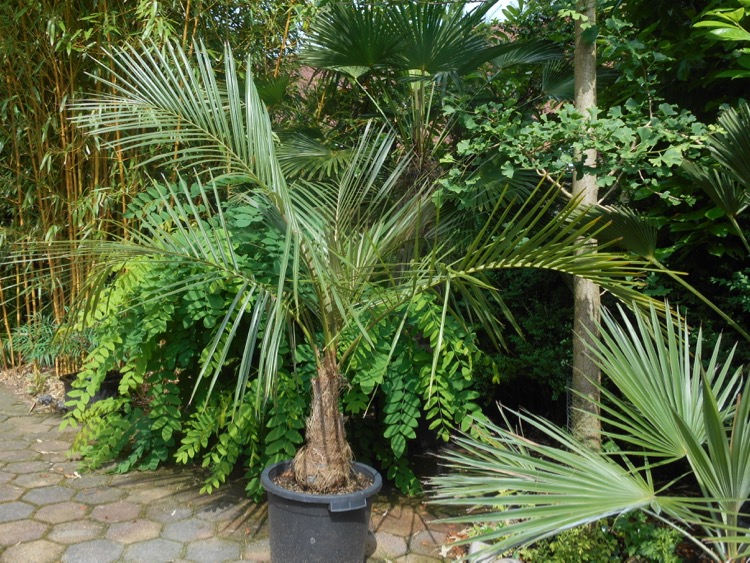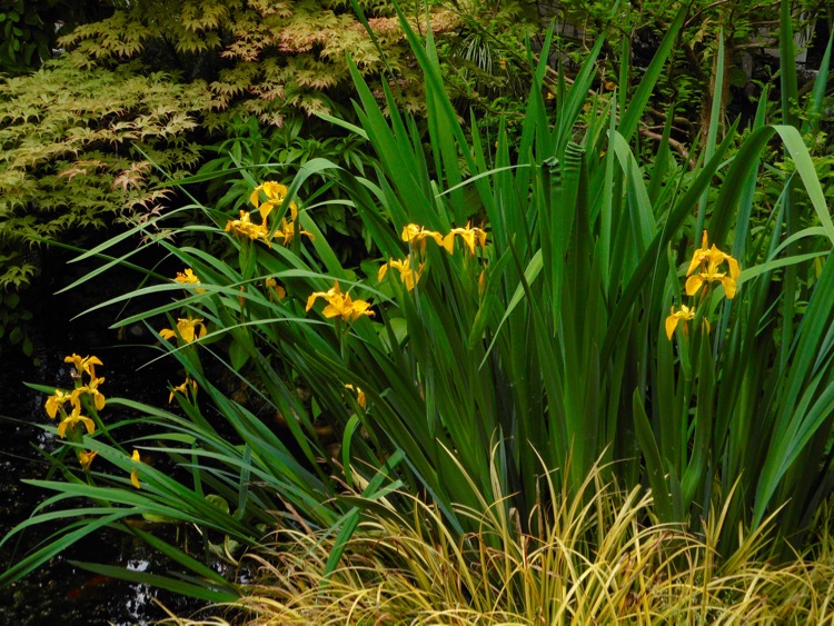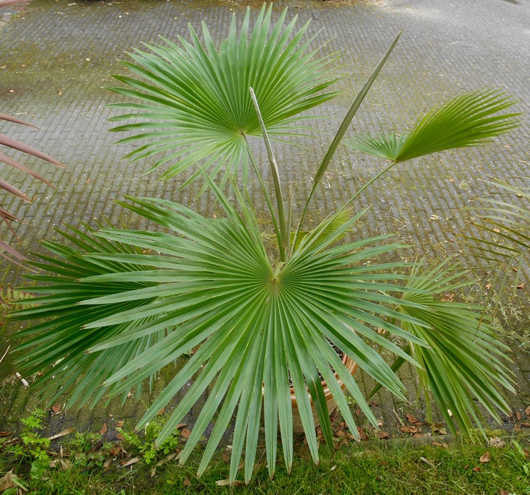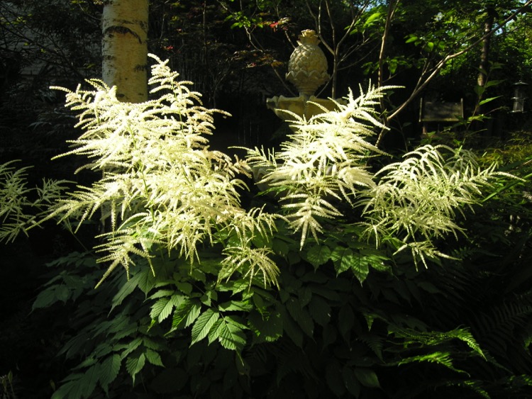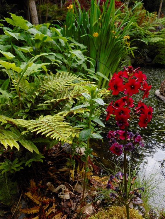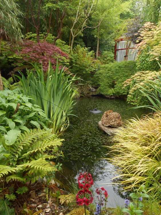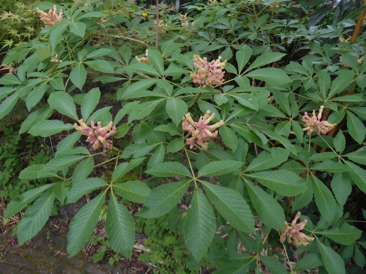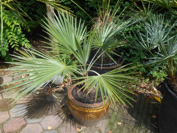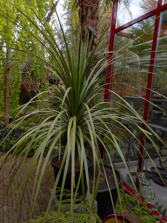 Met het donkerrode blad is Cercidiphyllum japonicum 'Rotfuchs'. Dit is een langzame groeier vergeleken bij de soort. De plant rechts daarvan is Acer x conspicuum 'Silver Cardinal' (synoniem Acer rubescens 'Silver Cardinal'). Deze bontbladige Acer is gevoelig voor zonnebrand zoals veel variëteiten Japanse esdoorns. Het verzamelen van Acers is een van mijn passies en ik kan de verleiding vaak niet weerstaan om weer met een cultivar thuis te komen. Voorlopig is zo 'n nieuwkomer gedoemd in een kuip te verblijven totdat ergens een plek vrijkomt.