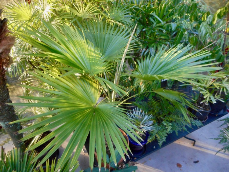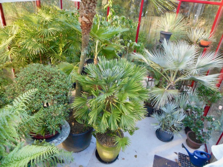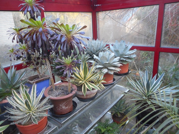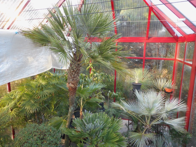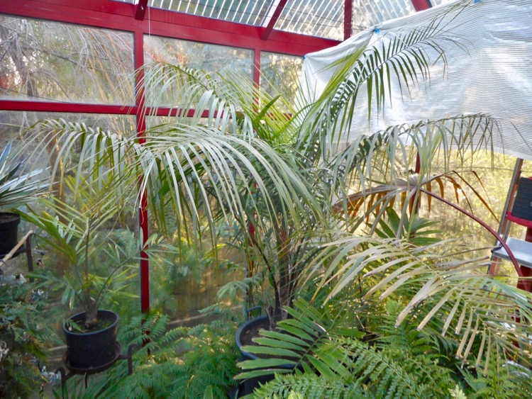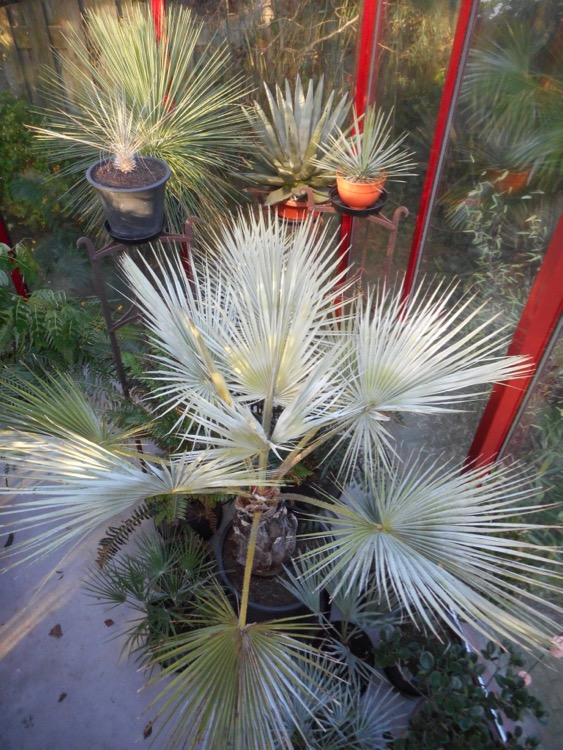 Vanwege de lage temperatuur en hoge luchtvochtigheid is er weinig omkijken naar de planten. Af en toe is er een uitvaller zoals gisteren een tot snot verworden vetplant. De planten die in de kas overwinteren (minimum 2 °C) verdragen minstens lichte vorst. Dat is geen garantie dat ze de winter goed doorkomen. Sommige soorten bleken niet bestand tegen maanden van lage temperaturen en hoge luchtvochtigheid - Howea forsteriana, Archontophoenix cunninghamiana en Phoenix roebelenii. Chamaedorea elegans waarvan je het verwacht heeft enkele winters goed doorstaan. Ravenea glauca overwintert voor het eerst in de kas. Latania lontaroides stond altijd binnen maar moest vanwege de omvang het veld ruimen. Chamaerops, Cordyline australis en Yucca rostrata trotseren de winter buiten. Ze staan gedeeltelijk beschut onder het dak overstek. Zo nodig gaan die ook de kas in. Yucca rostrata, Trachycarpus sp.(fortunei, wagnerianus, princeps, ‘new form’ takil ‘Kalamuni’ en geminisectus in de tuin worden niet beschermd. De geminisectus schuilt onder een glasplaat omdat deze soort een hekel lijkt te hebben aan nattigheid.