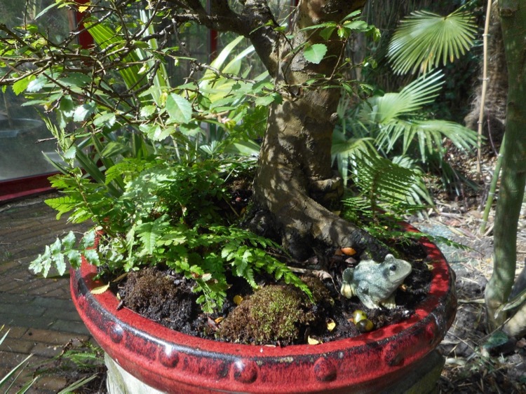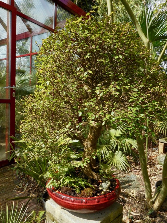 Vandaag beleven we hopelijk de laatste winterstuip, met 6°C en een NNW windkracht 6 is het nog niet bepaald aangenaam. In de zon en beschut voor de wind valt er al genoeg te genieten. Een Acer met oranje blad vormt de jaarlijkse primeur. Rhaphiolepis umbellata mocht voor de foto alvast even uit de kas. Bij de bolletjesvaren verschijnen nieuwe krullen. Onoclea sensibilis dankt zijn Nederlandse benaming aan de sporendragers. Het kangaroepootje is de nieuwste aanwinst. Ik ben benieuwd hoe de hernieuwde kennismaking met deze Anigozanthos 'Beauty Star' zal verlopen. Bij een vorige gelegenheid was het genoegen van te korte duur. Enkele palmen genieten hier een VIP behandeling zoals de Trachycarpus princeps 'New From' en een mini Cerifera in een sierpot die is meegekomen uit Japan.
