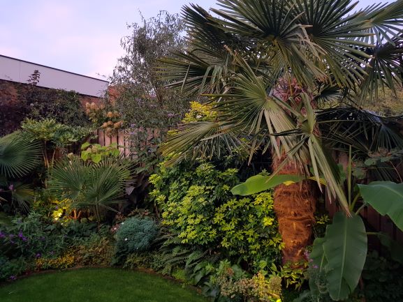 De volgende foto laat zien dat bbq-en gebeurt in een tropische hoek met Musa, Dicksonia en Phoenix. Alle zijn ook behoorlijk gegroeid maar alles blijft prettig in de aanblik en ik kan er nog goed langslopen met wat regelmatig snoeiwerk aan de Phoenix.