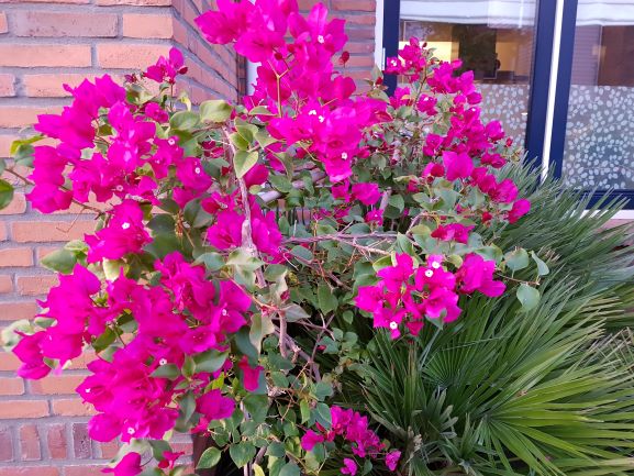 Ook de Jubaea en de Chamaerops in de voortuin groeien gestaag door. Geen harde groei en dat zie je gelukkig terug in de in mijn ogen perfecte groeivorm. De Jubaea met stevig, compact en enigszins gedraaid blad en de Chamaerops met dikke, korte bladstelen en een fraai bossig uiterlijk. Op de voorgrond een Rhapidophyllum welke langzaam maar gestaag groeit en bloeit. Drie bladeren dit jaar en een viere lukt misschien nog net. En de Bougainville, ook zo'n heerlijk succesnummer wat vrijwel aaneengesloten bloeit vanaf eind juni, begin juli. Nu is er weer een extra bloeigolf met massa's bloemen, het gaat maar door.