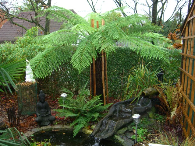Wauw, de grote boomvaren staat er mooi bij hé! Waarom de bamboe er rond? Voor de wind of heeft dit een andere reden?