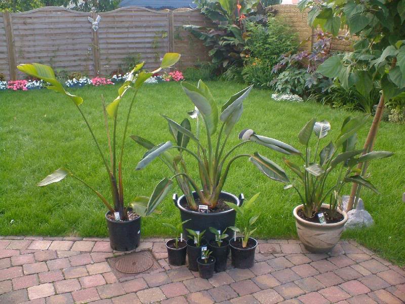 De achterste planten zijn S. nicolai en 2 keer S. reginae