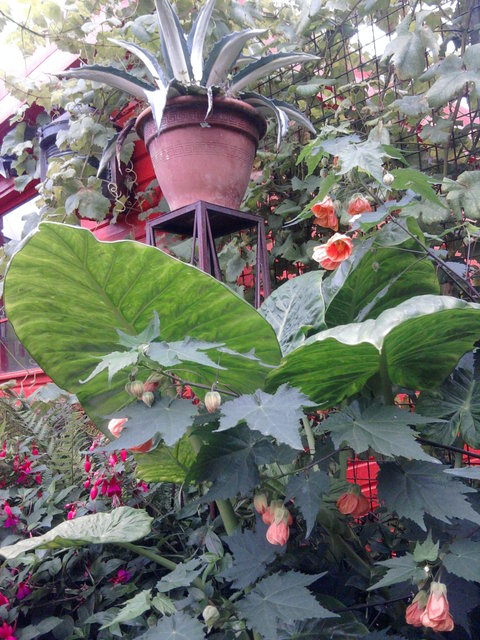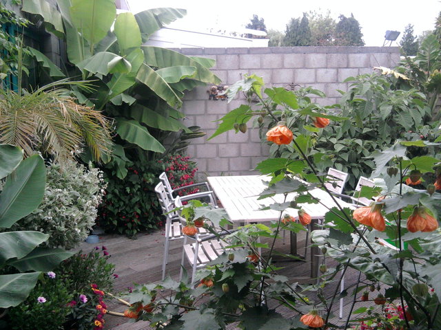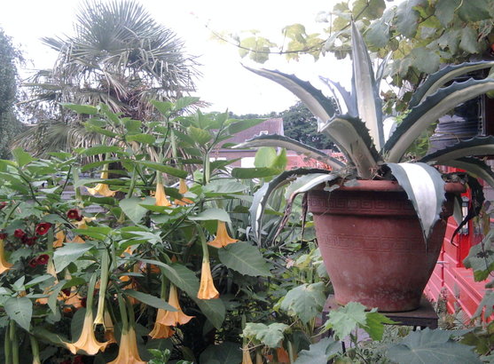 Gedurende het laatste weekend heeft de storm lelijk huis gehouden, maar uiteindelijk viel de schade nog mee. Ik heb de Brugmansia's en de Abutilons (die hadden zware kruinen vol met bloemen) moeten vastsjorren.