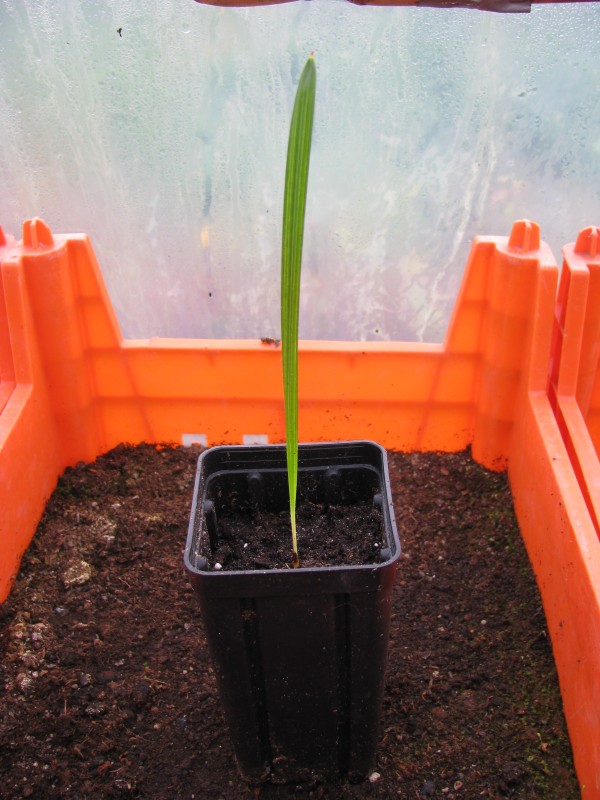 Verder heb ik ook nog een grote Brahea armata gekocht voor een prikkie. Momenteel ziet hij er minder mooi uit, daarom heb ik er ook zeer weinig voor betaald. Ook vier zaailingen van de Trachycarpus wagnerianus x nanus (erg duur voor zaailingen, maar ik verwacht er veel van), vier kleine Trachycarpus wagnerianus, een Latania loddigesii (euh, dacht ik toch ...)