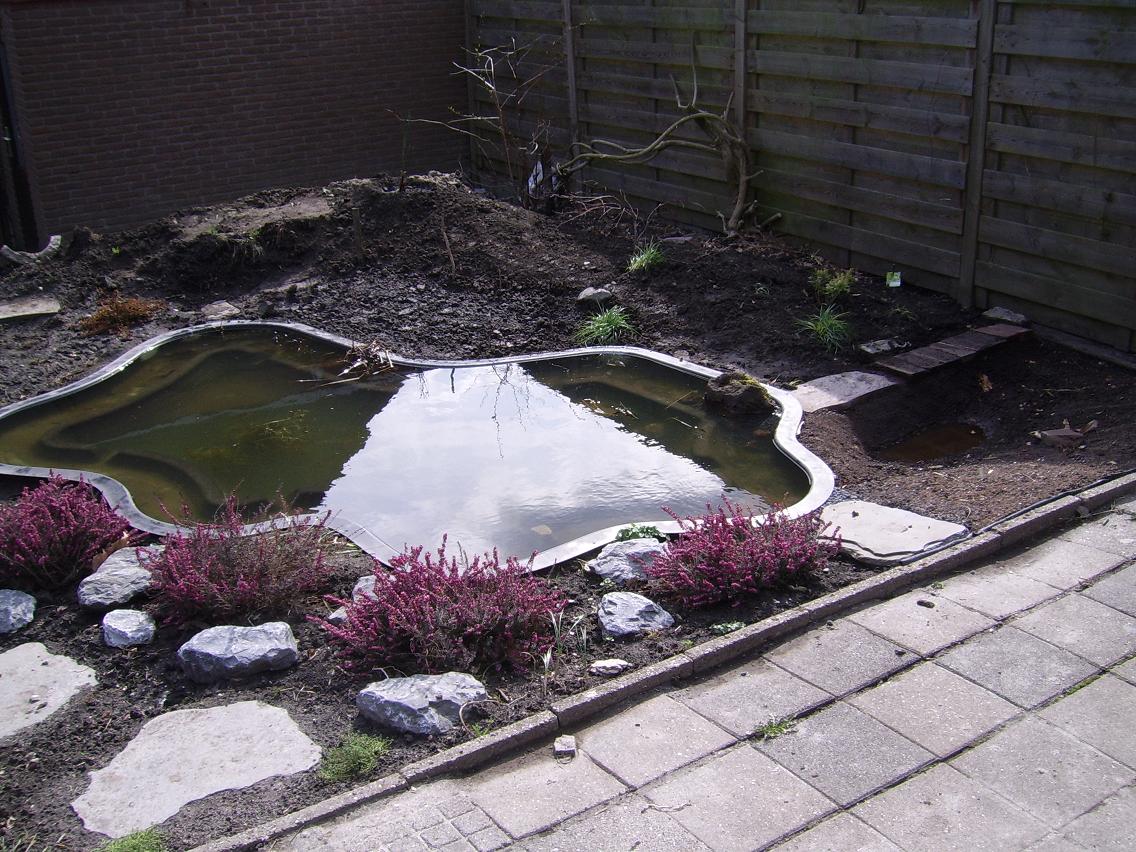Eindelijk voorjaar. Afgelopen zaterdag dus eerst eens naar de markt gegaan en Colocasia knollen gekocht. Ik heb ze tussen de vijver en het heuveltje gepoot (het natte deel op de foto). Als ik hier op de site lees heb ik ze misschien wat diep gepoot maar dan kan de laatste nachtvorst er hopelijk niet bij. Ik heb de algemene plantregel voor het poten van bollen aangehouden (2 a 3 keer de bolhoogte) dus ze zitten zo'n 10 a 15 cm. diep. Ik verwacht dat ze opkomen tegen de tijd dat er geen nachtvorst meer is (half mei).