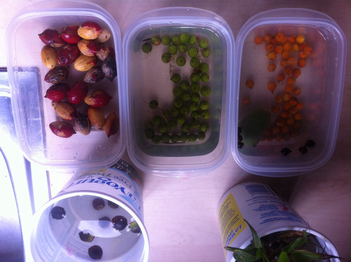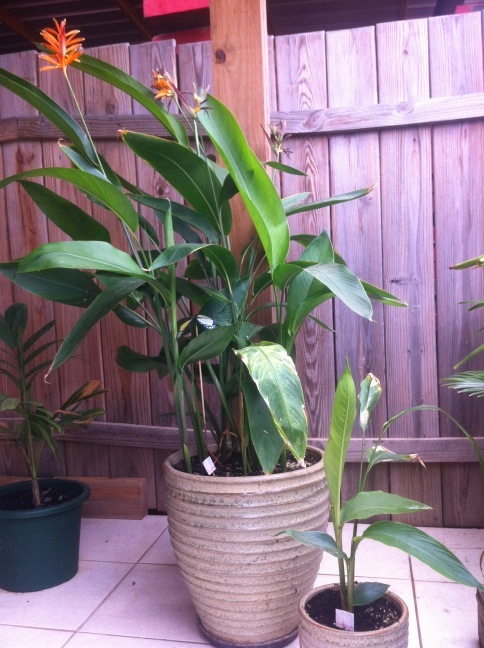 Met op de voorgrond in het kleine potje een jonge Heliconia aurantiaca