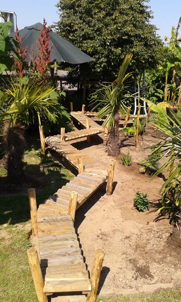 Eduard. het wandelpad moest een exotische tint geven, neemt wat plaats in, maar heb de breedte vrij smal gehouden. De kinderen houden er zeker van om erover te lopen, planken zijn 10 breed en met schoenmaatje 33-35 goed te doen....
