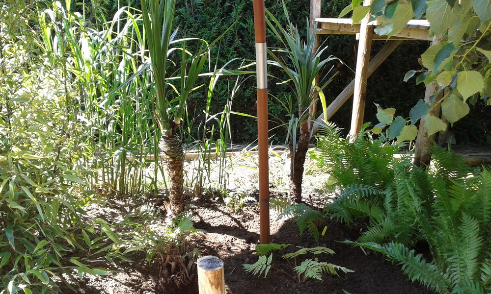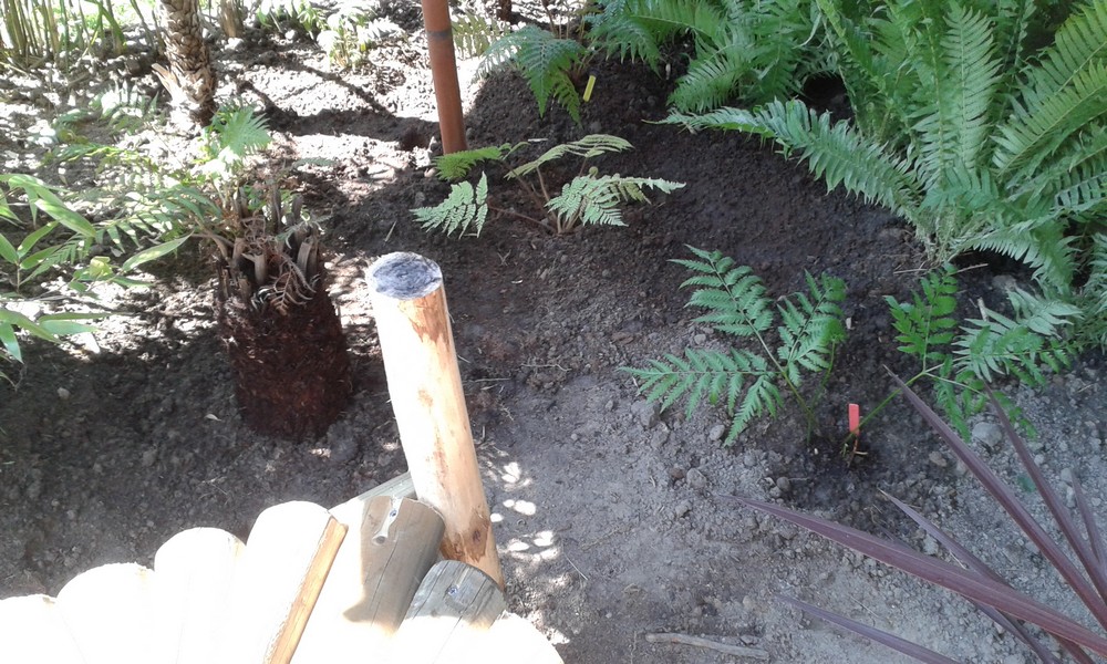 Grasveld weggehaald goed idee. Het palenpad ziet er avontuurlijk uit en is nog handig ook met hoogwater ;) Ik denk dat de Dicksonia antarctica ook veel beter tot hun recht komen in een wildere entourage. Een gazon oogt wat mij betreft nogal klinisch.