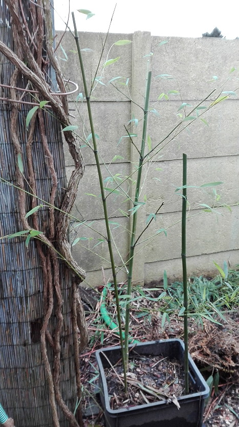 Enkele foto's van vandaag. De bamboe allemaal in bakken gezet en rond de bakken, nu nog zichtbaar, varens. Tevens snoeisel opgeruimd en grond klaargemaakt voor planten van coniferenhaag aan de noordkant. Komen ook nog rieten matten tegen die muur. Tevens klimrekken voor diverse klimmers klaar en de wisteria en trompetplant heel kort gesnoeid.