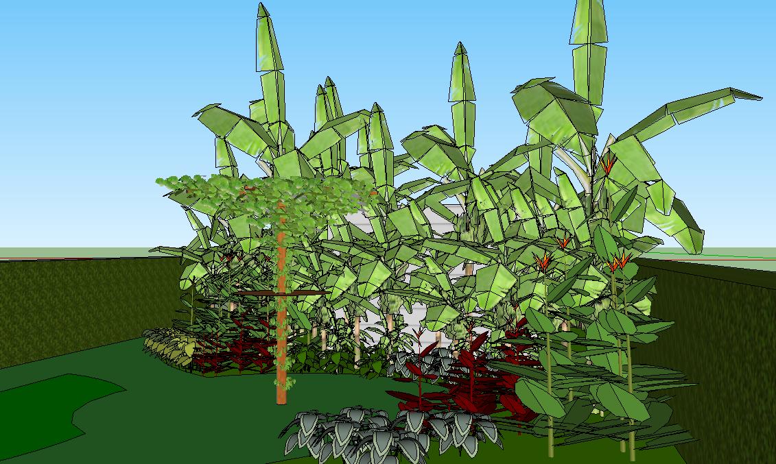 Dit alles heb ik eens uitgetekend in SketchUp om mijn idee een beetje duidelijk te maken. Heb zoveel mogelijk de werkelijke afmetingen van de planten gerespecteerd maar alles staat een beetje te dicht op elkaar getekend, maar dit zal toch nog enkele keren verschuiven.