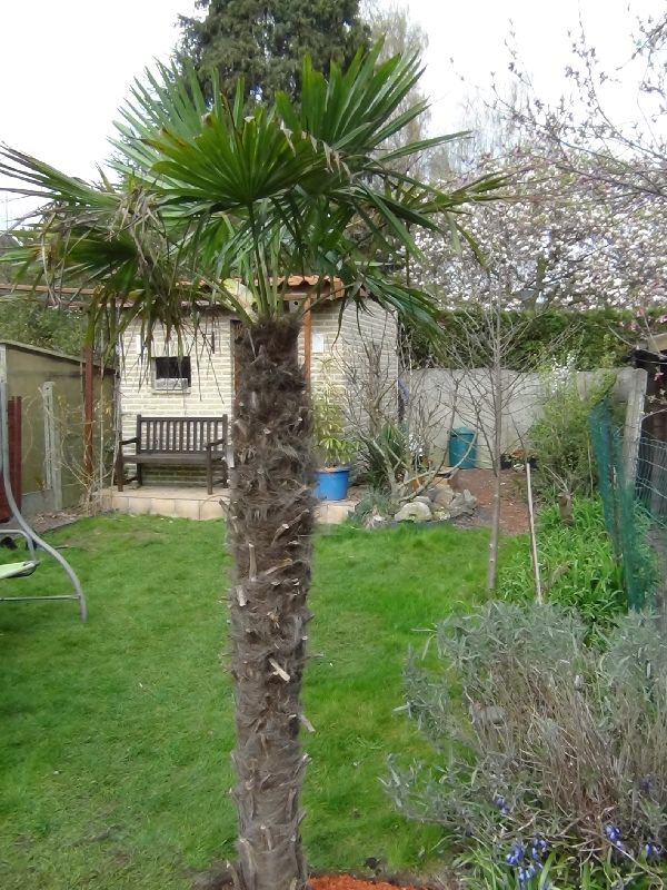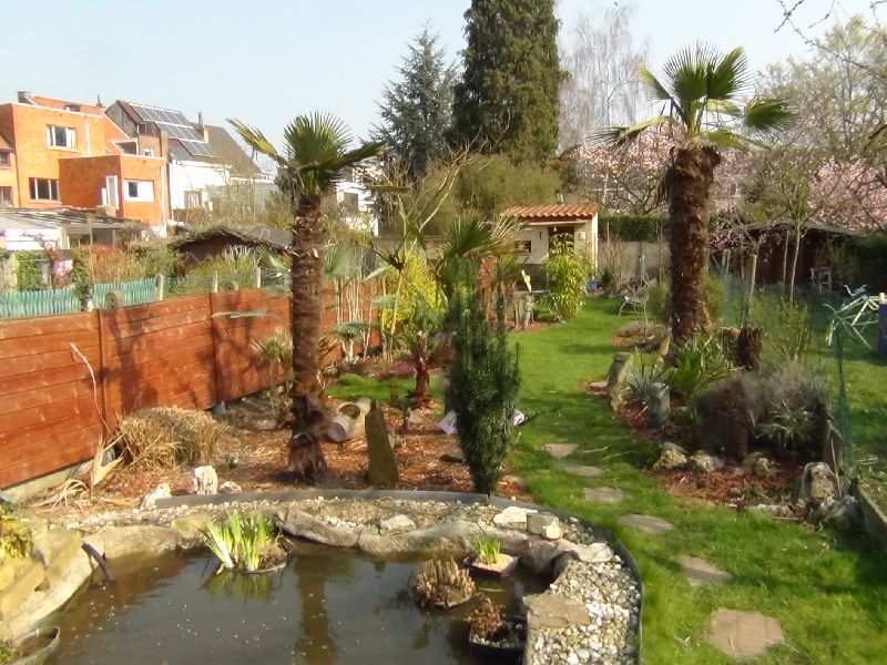 enkele nieuwe exemplaren in de tuin ,een grote en een kleine trachy een kleine sabal ,en een banaan uit rusland waar ik naar de naam van opzoek ben