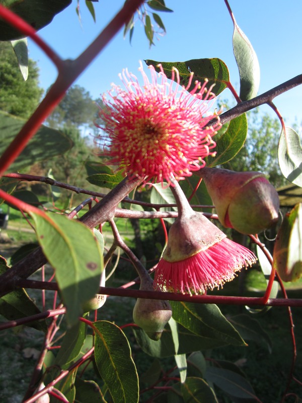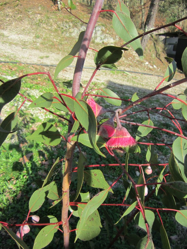 Thans staat te bloeien Eucalyptus caesia. Deze kleine soort bloeit altijd in de winter (ook in Australië). De plant zelf stelt niet veel voor, maar de bloemhoofdjes zijn mooi, en voor Euc-begrippen groot, tot 5cm. De plant is nu 2,5m hoog.