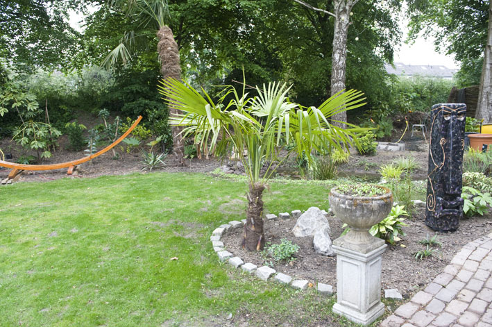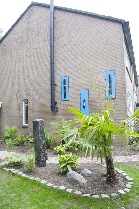 Die pijp is van de houtkachel en is dubbelwandig kortom weinig warmte aan de buitenkant, maar we hebben wel de boomvarens tegen die muur gezet en dat is niet toevallig, ik bedoel een huis straalt toch warmte uit en zeker daar bij die kachel zal het een paar graadjes schelen het is alleen geen contstante warmte.