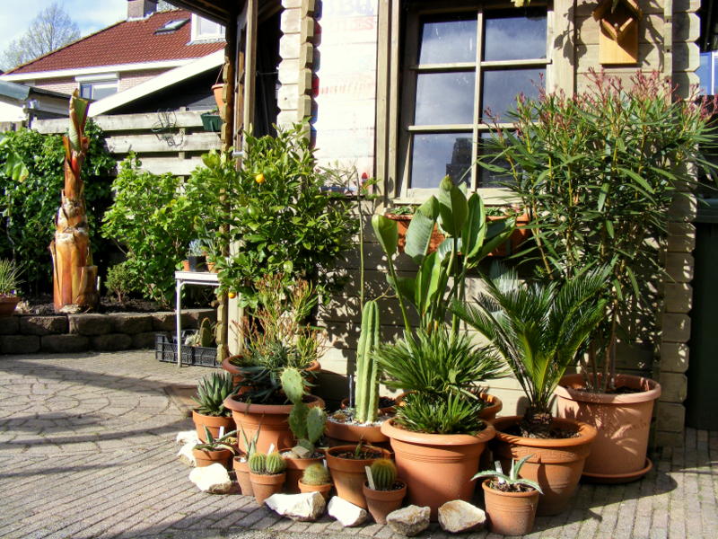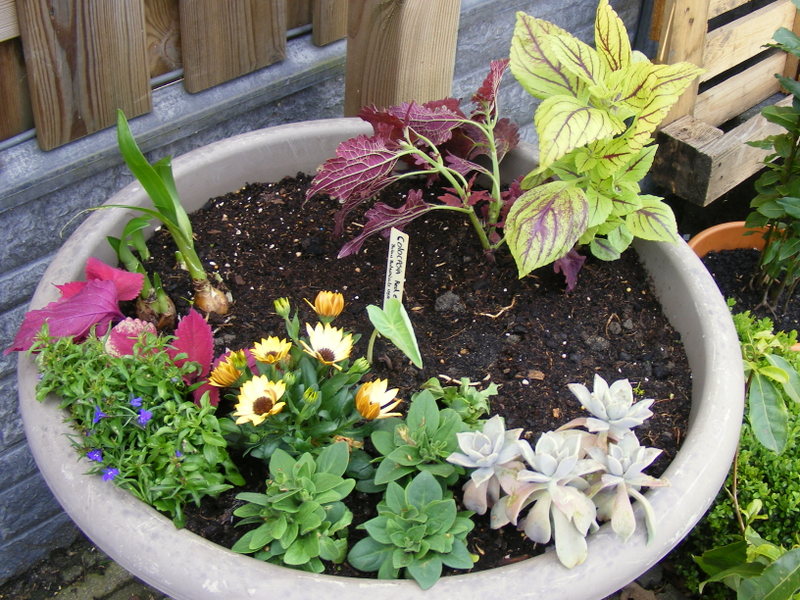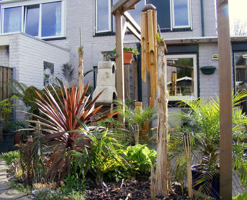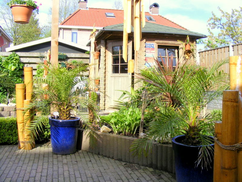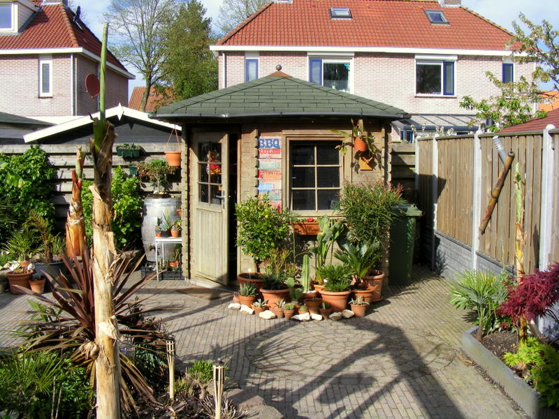 Tuin begin steeds meer vorm te krijgen en kleur! Veel planten moeten nog boven komen zoals de hedychiums en zeker de canna's. Het grote verpot werk is gedaan, nu elke keer een beetje van het kleine spul.