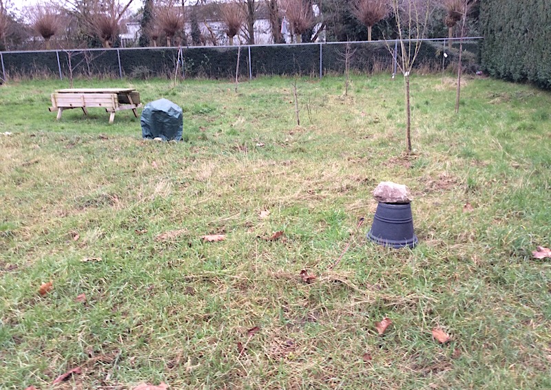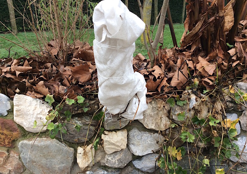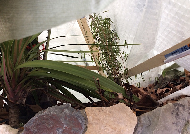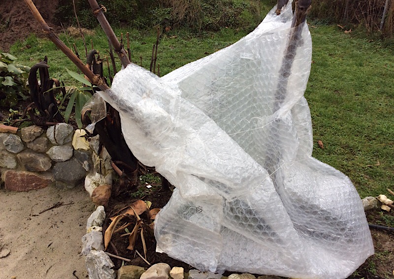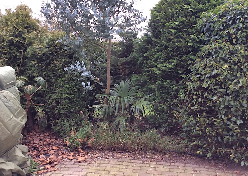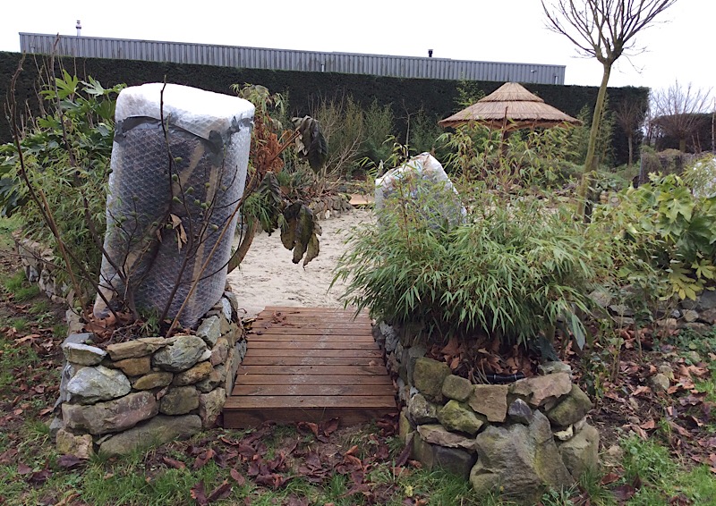 Keer staat ook (min of meer perongeluk) oa een Cordyline onder en bamboe. Diameter van de constructie is meer dan 3 meter. Op de 2e foto de musa basjoo ingepakt en een jubea chilensis (houtwerk met zeil aan de bovenkant om droog te houden en boomjas er omheen) Op de derde nog meer musa basjoo en o.a. een onbeschermde lagerstroemiaboom op de achtergrond.