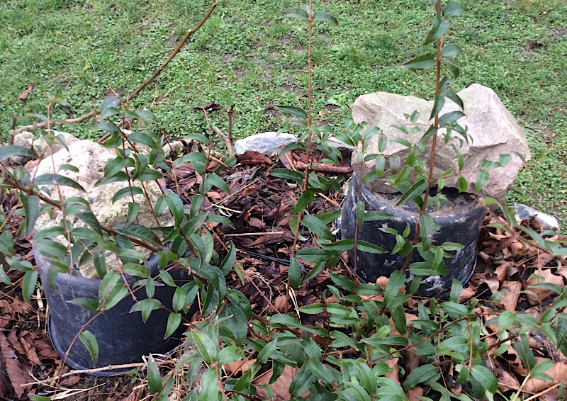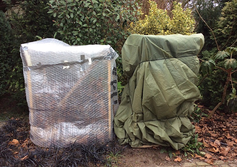 Op de eerste een boomdahlia, waarvan ik de basis van de stammen toch maar wat heb ingepakt. Op de 2e een schefflera taiwaniana onder een emmer en een Heliconia schiedeana. Op de derde een citroenboompje en kleine paw-paw onder emmer en grote zak.
