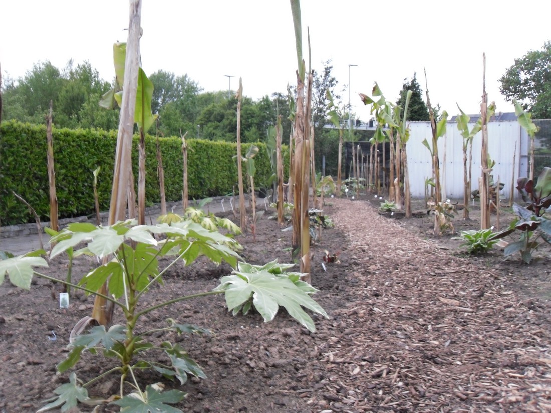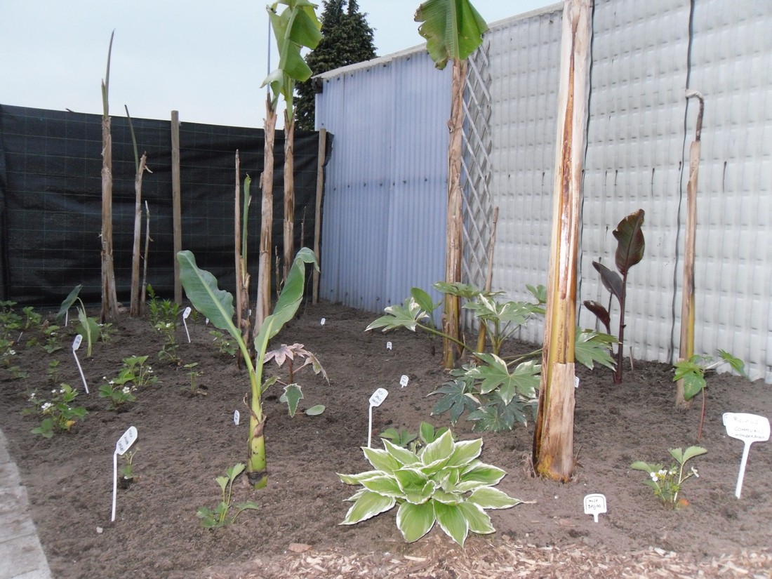 Ben ook begonnen met de borders op te vullen met de specialere banaantjes, colocasia's en bladplanten.